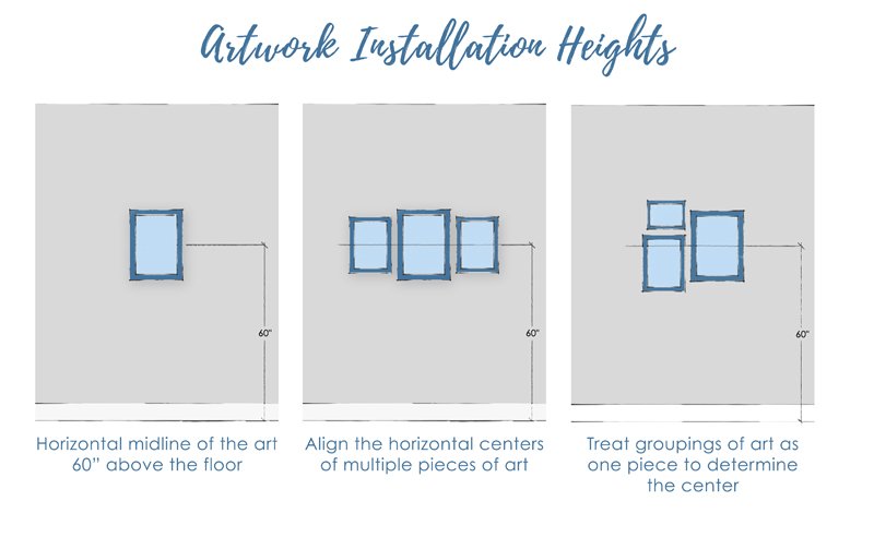 Most often, artwork is hung too high. A good rule of thumb - the center of the piece of art should be at eye level. The horizontal midline of the artwork should be around 60” above the floor. If everyone in your household is very tall, you might need to adjust that number accordingly. We use 60” as the average eye height for most adults. When hanging multiple pieces of artwork in a row or in the same room, align the horizontal centers first, not the top or bottom. Treat the groupings of artwork as one large piece in order to determine the horizontal center. See images below to see what we mean by “horizontal centers”.