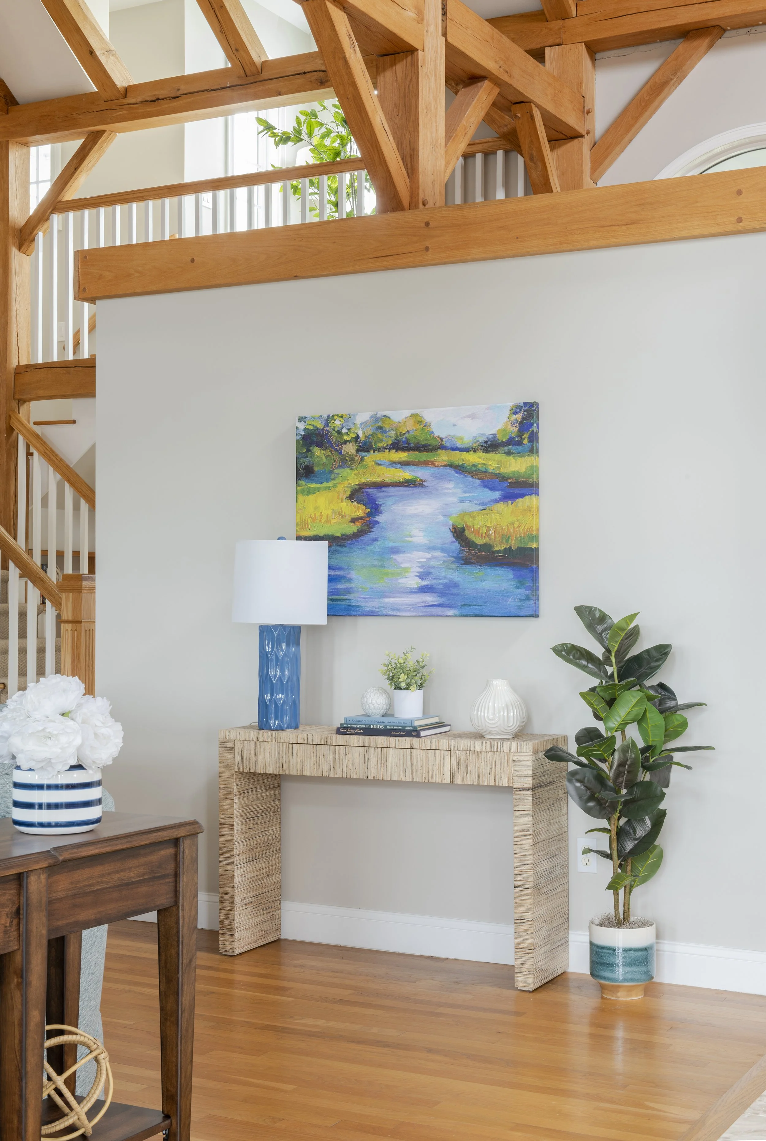 If you’re hanging artwork above a piece of furniture, the artwork should relate to the furniture below. Here, you’ll break that 60” midline rule and instead put the artwork close to the piece of furniture, usually 8”-10” between the bottom of the frame and top of the furniture. If the furniture is low, you’ll want a tall piece of art to fill the height.